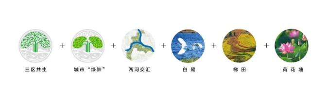 三个颜色分别源自植被、阳光、水,象征 “生态、生活、生机”的核心理念;