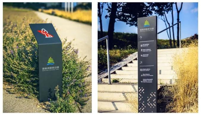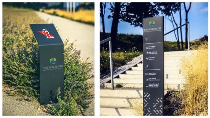 林水相依映。汇入公园树木的形色层次,并将象形字“水”嵌入其中,巧妙形成留白,渲染公园水泽林木、生态多样、林水相映的优美意境;