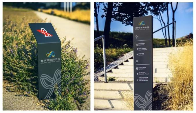 标志的整体造型由三部分构成,体现公园“三区共管”的理念。三部分间的留白,与公园鸟瞰图中的水脉走向暗合。作为北京大山水格局的一部分,突出公园“两河交汇”的特色;