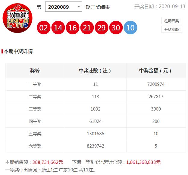 据省福彩中心检索,2020年9月13日双色球第2020089期开奖,红色球号码:02、14、16、21、29、30,蓝色球号码:10,全国共开出一等奖11注,单注奖金720万元。位于肇庆市高要区金渡镇东升路金岛市场侧的44170641福彩投注站包揽广东所中出的10注一等奖,中奖票面是一张价值20元进行了10倍投注的单式机选票。