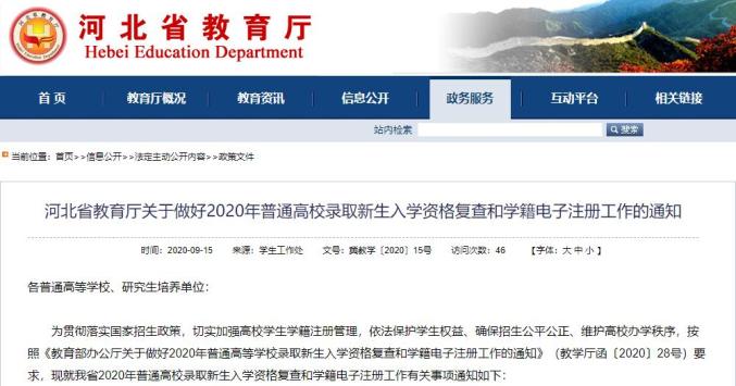 河北省教育厅关于做好2020年普通高校录取新生入学资格复查和学籍电子注册工作的通知
