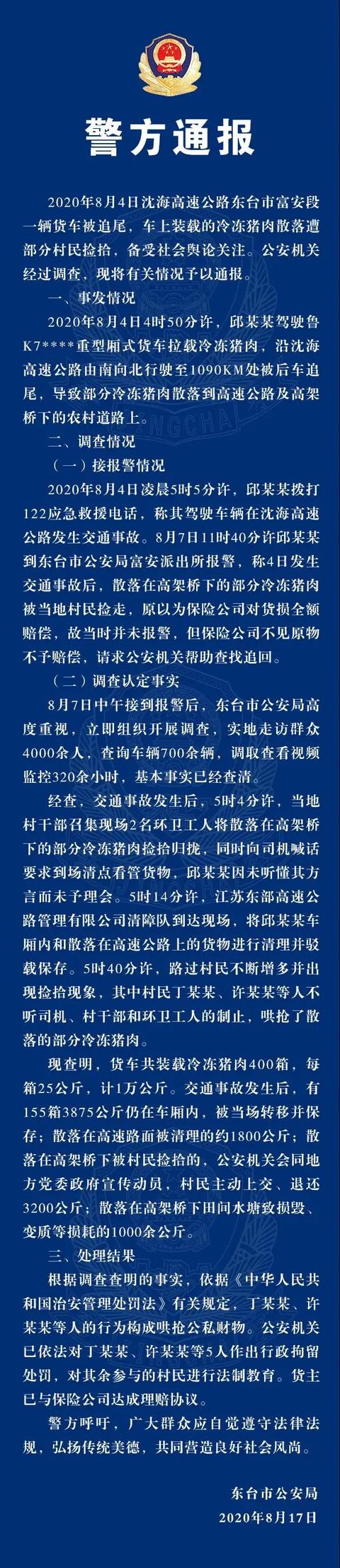 8月17日,东台市警方发布通报:丁某某、许某某等人的行为构成哄抢公私财物,当事相关5人已被依法行政拘留。