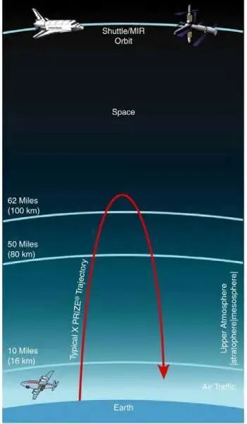 大气层很厚,超过1000km。大气呈非均匀分布,对流层(地表向上20km内)聚集了全部大气质量的四分之三。越往高处,空气密度越小,达到一定高度后,稀薄的大气将难以产生支持飞行器飞行的足够升力;飞行器只有靠提高速度,才可能获得足够升力来支撑自身重量。在大气密度连续变化的分布里,100km成了一个奇妙的高度。这里的空气密度仅为海平面空气密度的220万分之一。经钱学森的老师、著名科学家冯•卡门计算,这个高度是轨道飞行器的最低高度,即达到第一宇宙速度7.9千米每秒的飞行器,可以持续轨道运行,而不会被地球引力吸向地面。