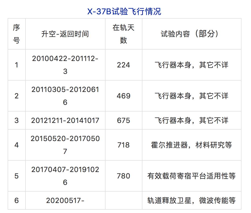 X-37B已先后完成5次太空飞行。2010年4月22日首次执飞,发射后进入到高度430-450 千米、倾角28至40度的轨道。据分析,前三次主要考核飞行器本身与在轨控制状况,验证结构布局设计、控制技术、长期待轨的任务管理与能源等。
