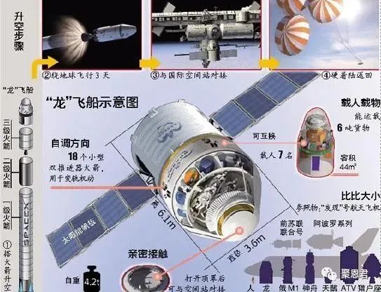 2010年12月8日,“龙”飞船搭载“猎鹰9号”火箭,成功首飞。2012年5月25日,“龙”飞船与国际空间站成功对接,成为有史以来首艘造访空间站的商业飞船。经空间站内的宇航员数日卸载飞船货物,又装上运回地球的物品后,飞船于31日成功返回。迄今,货运“龙”飞船共执行了19次空间站补给任务。