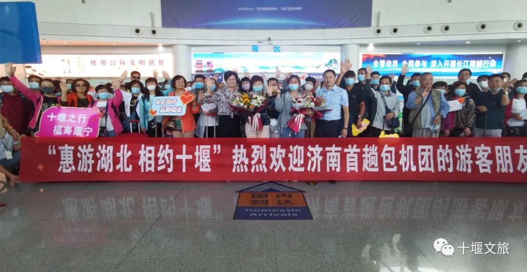 飞机上103名游客大都来自山东济南,他们从齐鲁大地来到荆楚大地,将在湖北度过8日7夜。