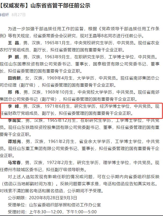 8月27日,山东省委组织部官方微信号公示,现任省财政厅党组成员、副厅长的李峰,拟任省委管理的国有重要骨干企业正职。公开信息显示,李峰出生于1971年,拥有经济学博士学位。现任省财政厅党组成员、副厅长。同时,据山东省财政厅官网显示,李峰在财政厅期间主要分管资产管理处、金融处、国有金融资本监管处、政府引导基金管理处、省政府投融资管理中心、政府和社会资本合作管理中心、省国有资产统计评价中心,负责联系省财金投资集团有限公司、省农业发展信贷担保有限公司。