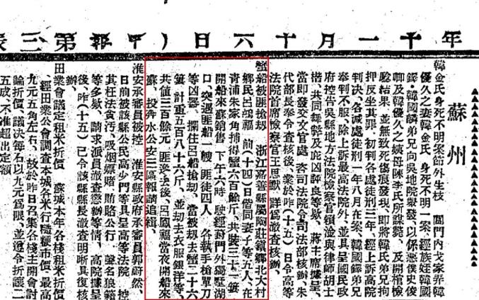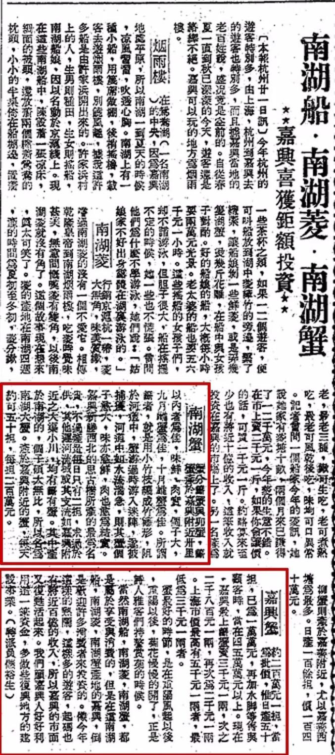 1930年11月16日《申报》一则名为“蟹船被匪抢劫”的社会新闻,可见80余年之前,现今上海地区的蟹品还曾经远销苏州,而螃蟹作为重要货物,时常为盗贼觊觎。