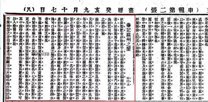 当然除了这类搏人眼球的社会新闻,《申报》上还有大量蟹品、食蟹的生动记载。如这篇1923年10月26日的“記蘇州之蟹”,其中列举了苏州产蟹的品种、烹煮的方法、捕蟹的工具和手段等等,甚至还提及了现今上海人非常熟悉的“六月黄”,可谓详尽。