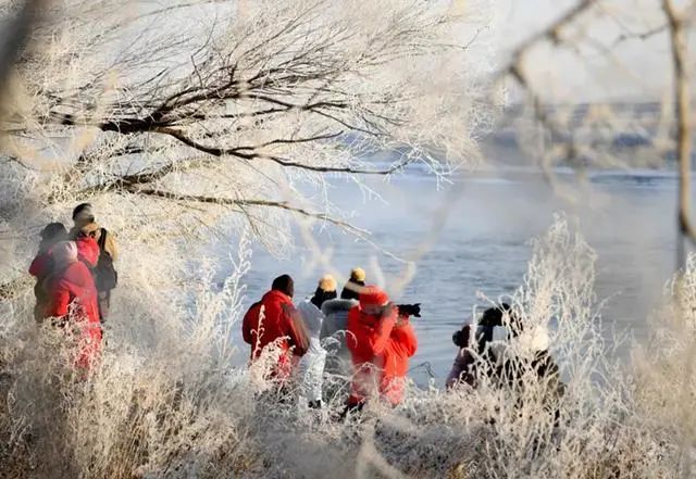 这里的树木形状多样而奇特,松花江水曲曲折折蜿蜒而过,沿江的垂柳挂满了洁白晶莹的霜花,湛蓝的天空与银装素裹的雾凇融合,江风吹拂银丝闪烁,好似仙境一般。