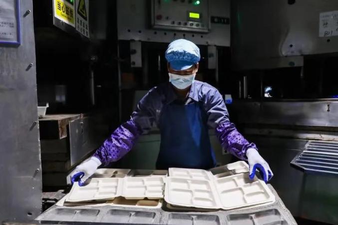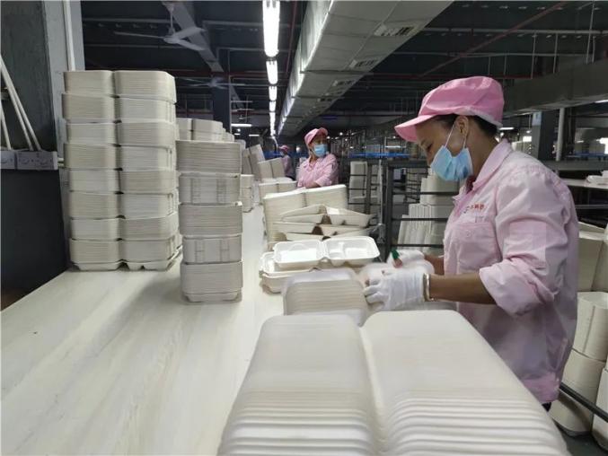 疫情期间,广西华宝纤维制品有限公司生产车间一角。(企业供图)随后,记者来到广西洁丰生物科技有限公司走访,厂房里,机械声轰鸣。工人们正忙碌地将一次性可降解餐具打包、堆放。