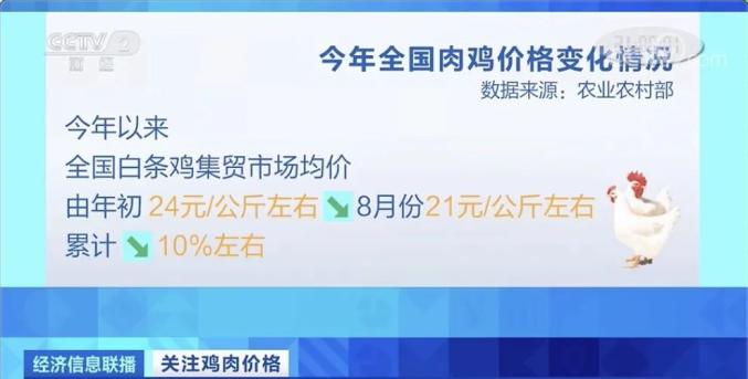 据农业农村部监测,今年以来,全国白条鸡集贸市场均价,由年初每公斤24元左右降至8月份21元左右,累计下跌10%左右。9月份前两周白条鸡价格每公斤21.9元,同比下降幅度超过6%。