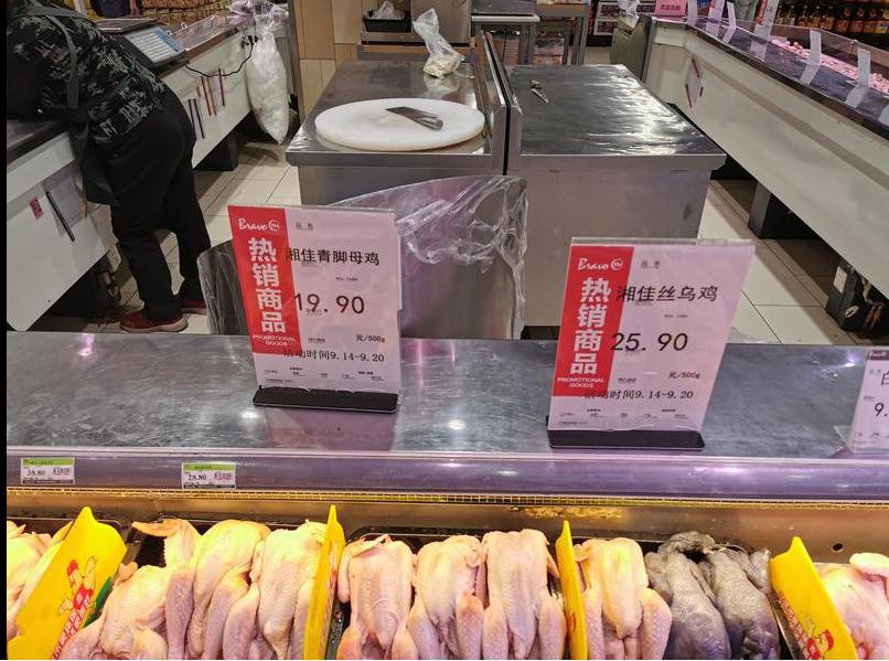 除此之外,柜台上的热销商品栏还显示,9月14日至20日,湘佳丝乌鸡每500克25.9元;16日,鸡爪、鸡腿等商品均有不同程度的优惠。记者接着探访了华润万家第一街区店,当日青脚鸡由每500克24.8元降至19.9元,优质麻鸡由每500克28.8元降至17.9元,散装鸡腿也从每500克25.8元降到19.9元。