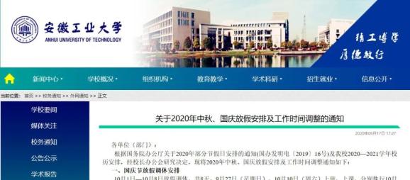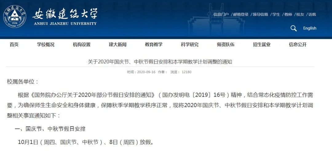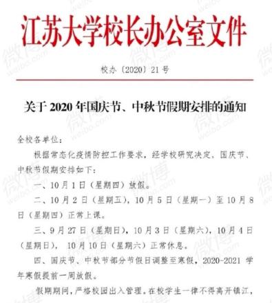 10月1日—10月8日放假调休,共8天。9月27日(星期日)、10月10日(周六)上班、上课,分别执行10月5日(星期一)和10月6日(星期二)的教学计划。2020级本专科生10月1日-3日放假(原地休假不离马),10月4日起按计划开展军训及国防教育相关活动。