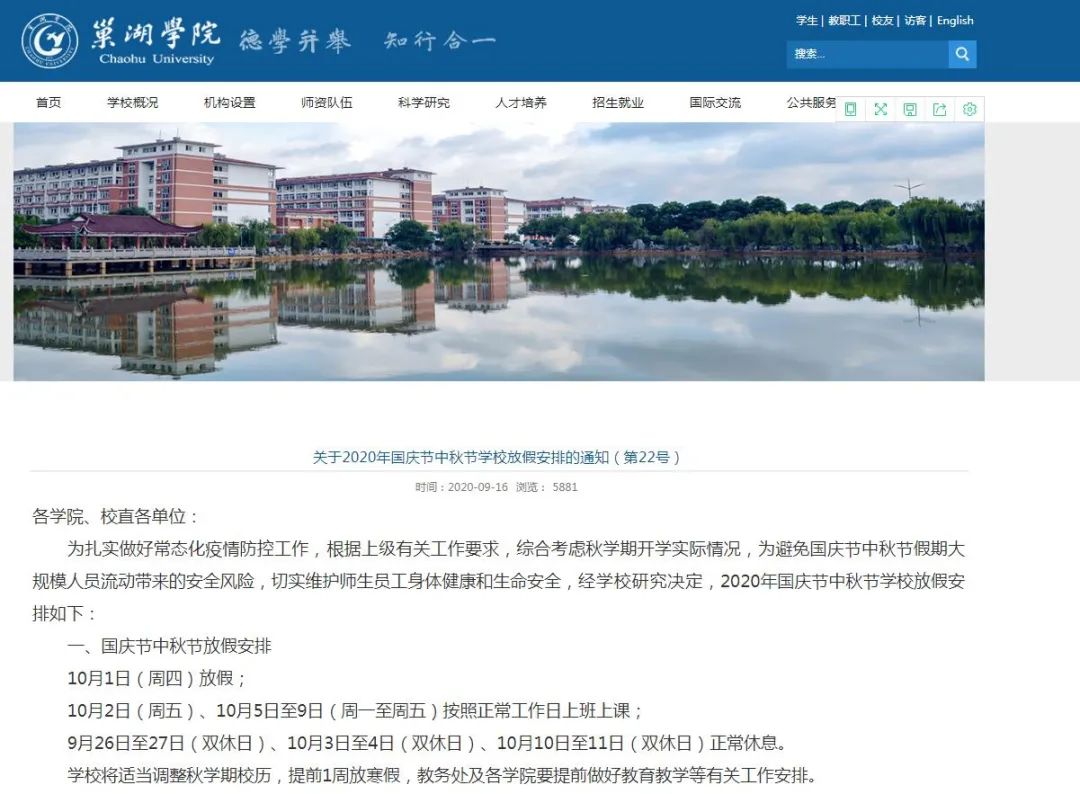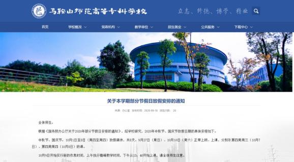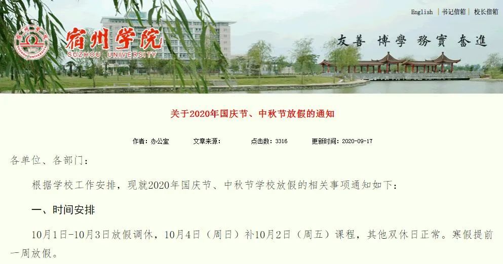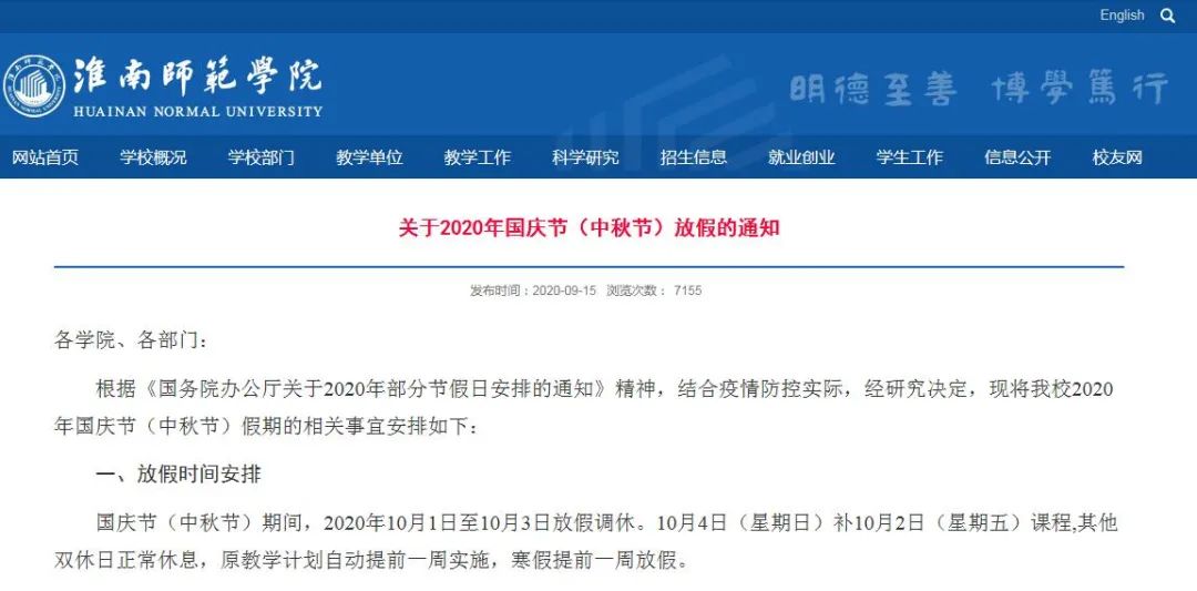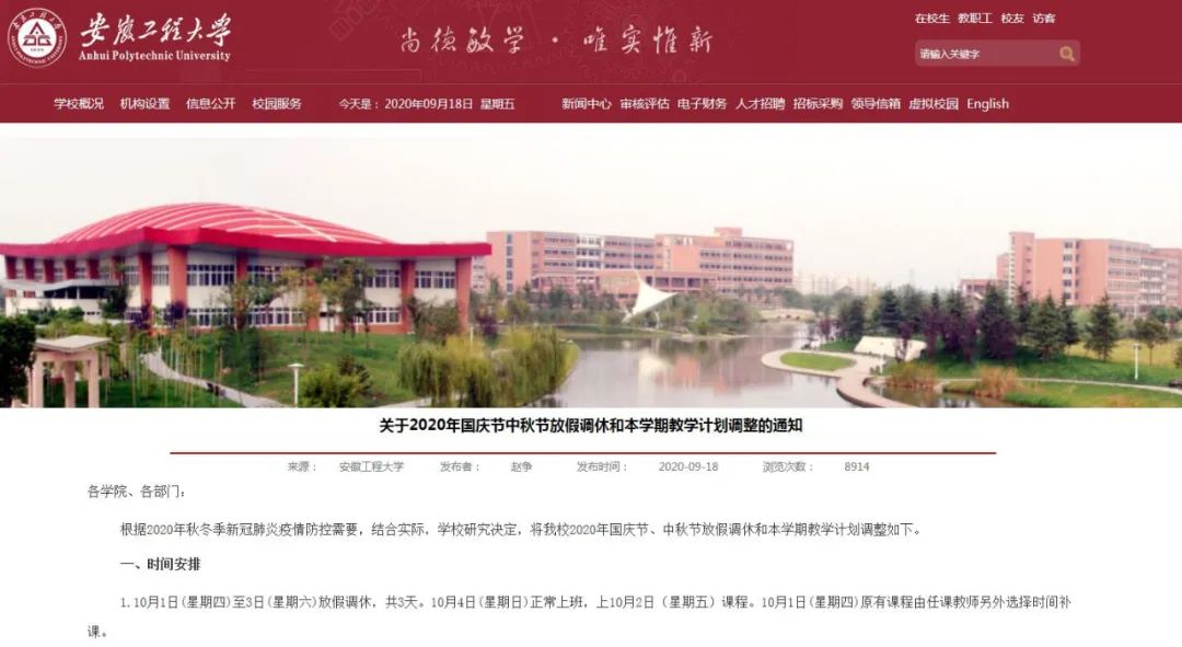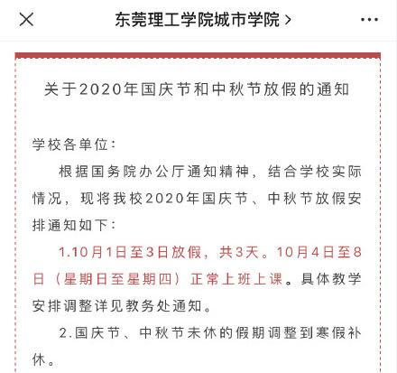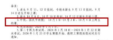 国庆节(中秋节)期间,2020年10月1日至10月3日放假调休。10月4日(星期日)补10月2日(星期五)课程,其他双休日正常休息,原教学计划自动提前一周实施,寒假提前一周放假。