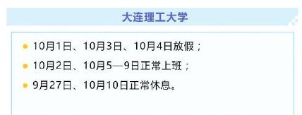 10月1日(周四)放假;10月2日(周五)、10月5日至9日(周一至周五)按照正常工作日上班上课;9月26日至27日(双休日)、10月3日至4日(双休日)、10月10日至11日(双休日)正常休息。