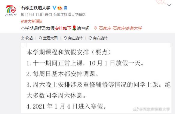 10月1日-10月3日放假调休,10月4日(周日)补10月2日(周五)课程,其他双休日正常。寒假提前一周放假。