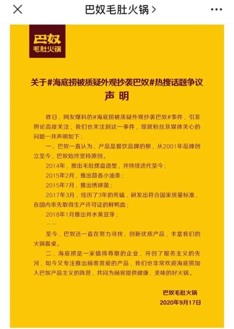 昨日晚间,针对近日网友热议的“海底捞被质疑外观抄袭巴奴”一事,巴奴毛肚火锅在其官方微信公众号发布声明表示,巴奴一直认为,产品是餐饮品牌的根,巴奴自品牌创立至今,始终坚持原创。