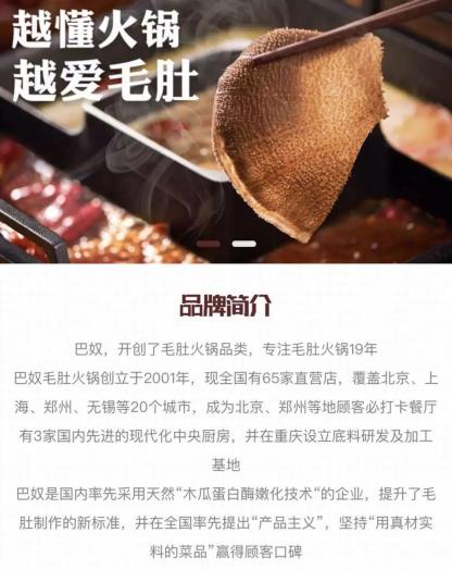 巴奴官网显示,巴奴,创立于2001年,开创了毛肚火锅品类,专注毛肚火锅19年。拒绝火碱发制,国内率先采用天然“木瓜蛋白酶嫩化技术“制作毛肚,推动火锅行业更加绿色健康。在巴奴的带动下,2015年全国火锅业呈现“毛肚热”。至今,毛肚点单率在全国超越羊肉、牛肉,成为火锅的头道招牌菜。在中国餐饮行业,首个提出 “产品主义“理念,用真材实料的产品赢得顾客口碑。虽未上市,但巴奴凭借毛肚在国内“火锅界”占有一席之地。目前巴奴在全国现有65家直营店,覆盖北京、上海、西安、郑州、苏州等20个城市,成为北京、郑州等地顾客必打卡餐厅。在重庆自建底料研发及加工基地,3个国内先进的集加工、仓储、物流配送为一体的现代化中央厨房,面向社会开放。