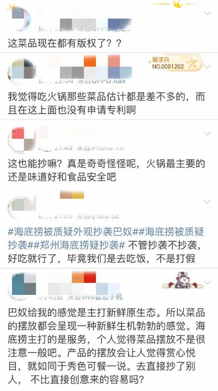 该消息一出立即引起网友热议,有部分网友认为,摆盘高度相像,拒绝抄袭;也有部分网友表示,火锅菜品摆盘大同小异,还是食品味道和安全最重要。