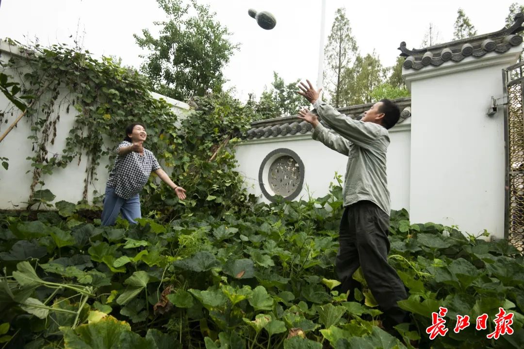 19日,在美丽休闲乡村——东西湖区东山街遮湖岗村,农民在家门口摘南瓜。记者金思柳 通讯员高国鹏 摄