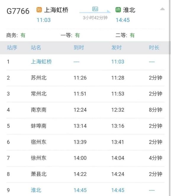 这对高铁为G7766/8次,于9月29日-10月2日、10月5日-10月9日开行,二等座车票售价每张313.5元。其中,淮北-上海全程约4小时32分;在淮北站停留近两小时后折返,返程约3小时42分。