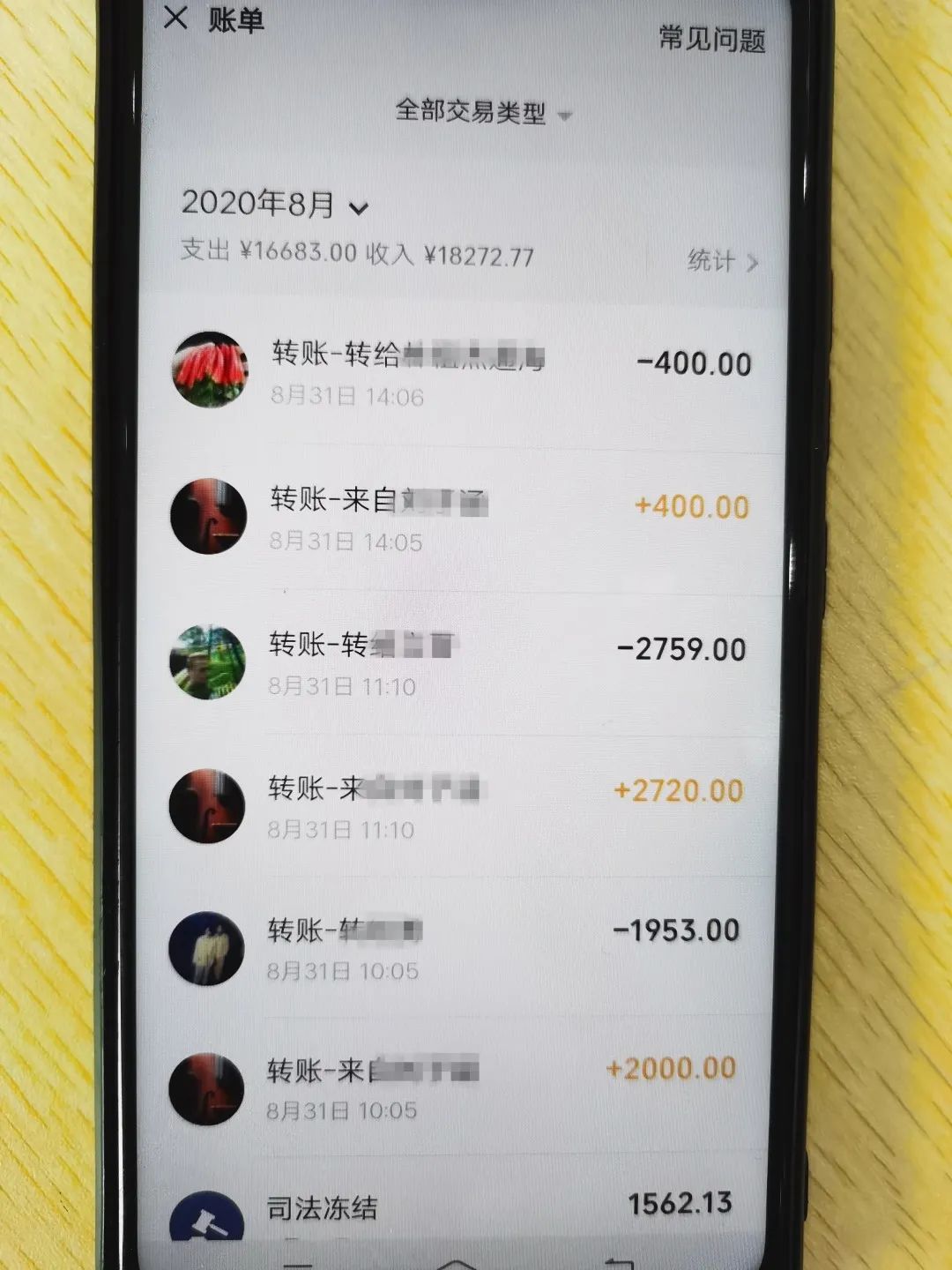 执行员进一步调查发现,刘某微信9月份收支达到七万多元,甚至有两笔万元的转账,刘某收到后立刻转了出去,同时在转账记录中发现“司法冻结1562.13元”的提示信息。