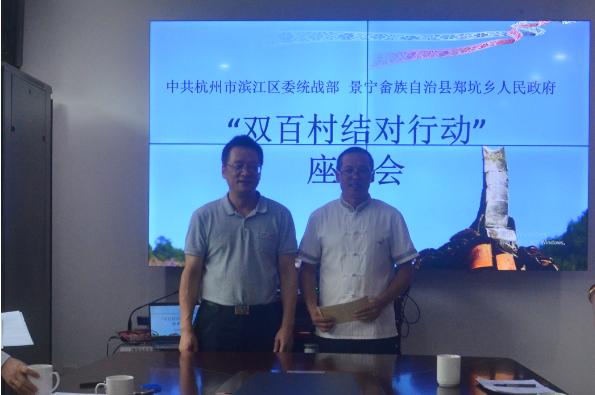 9月19日,杭州高新区(滨江)党委统战部 “双百村结对行动”暨“滨滨有礼·景宁郑坑行”签约仪式在景宁郑坑乡举行,4个公益帮扶项目落地景宁畲族自治县。