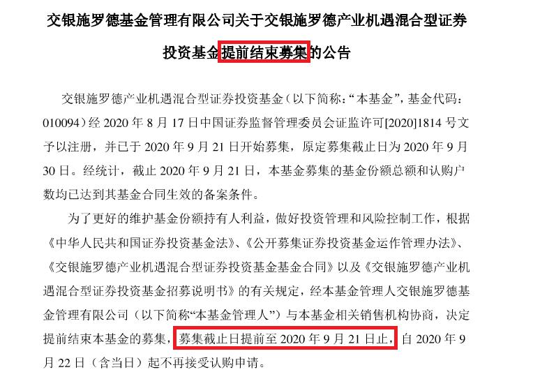 据渠道人士透露,截止9月21日中午,交银产业机遇混合募集金额约达40亿。而到了下午15点,仅通过交通银行单家银行的募集金额就达到45亿元,招商银行也完成了接近20亿元的销售金额,兴业证券代销规模也达到2亿元,此外,通过电商渠道加上直销渠道的销售金额为1亿元左右。截止下午17点,交银产业机遇混合合计募集金额超过70亿元,基金公司公告提前结束募集,实现“一日售罄”。