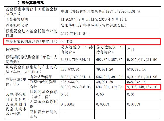9月14日由浦发银行主代销发行的易方达悦享一年持有混合基金,原定募集截止日为9月25日,而后因为发行火爆,仅发行了3天时间就提前结束募集,短短几个工作日内销售金额超过90亿元。