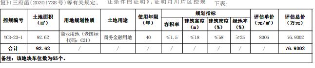 本次挂牌出让宗地位于三亚市月川片区控规YC3-23-1地块内,CGCS2000坐标系面积92.62平方米(海南平面坐标系面积92.57平方米)。用地四至及界址坐标详见地块勘测定界图。该宗地规划用地性质为商业用地(老国标代码:C21),对应土地用途为商务金融用地。