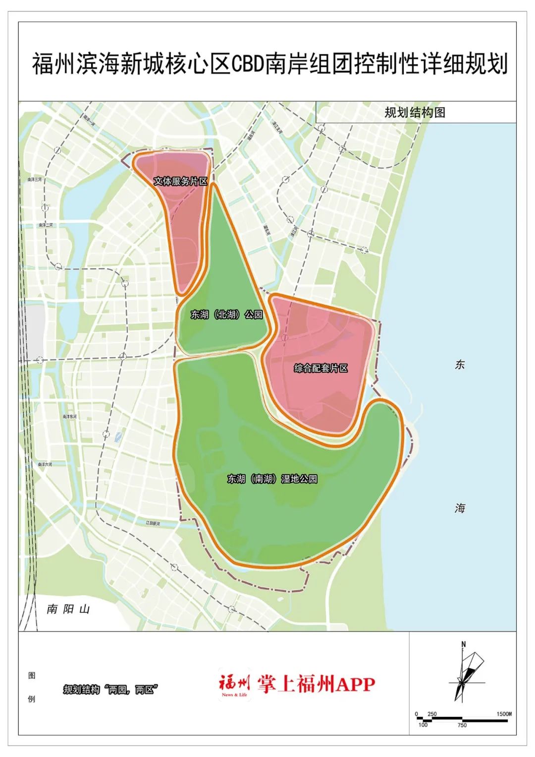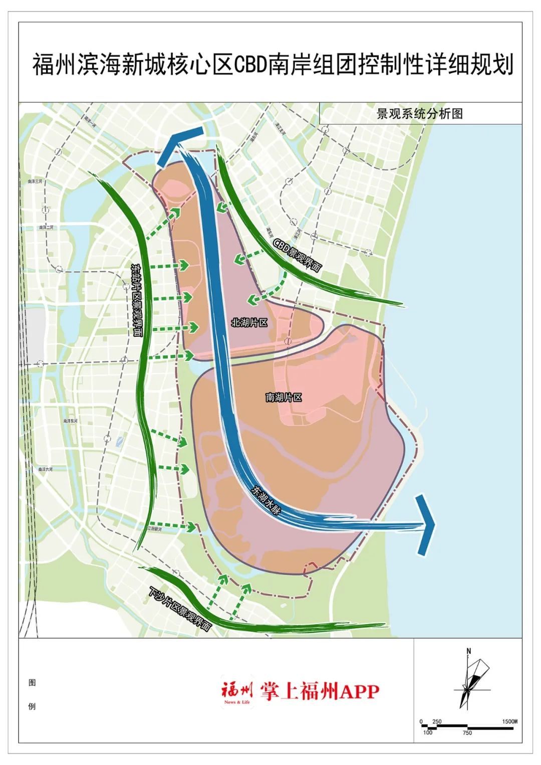 本组团是福州滨海新城的生态景观核心,建设以生态和游憩功能为主导,集休闲、文化、体育、商业等功能为一体的城市生态绿核。