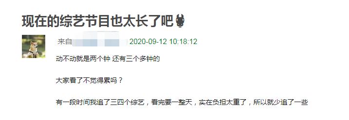 视频节目,尤其是综艺节目的时长被不断拉长。2小时起步是常态,3小时也不稀奇,再加上各类由几分钟短视频组成的花絮衍生,“军训式看剧追综”,早已从搞笑玩梗变成了一种无可奈何的自我解嘲。