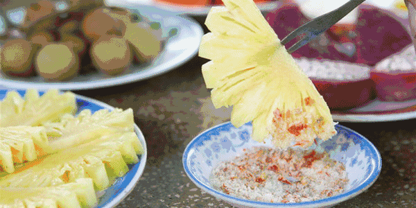 在海南街头见到卖水果的阿姨往水果里加一勺辣椒盐,千万不要觉得他们在制作什么黑暗料理,这就是最地道的海南吃法,毕竟,在海南人看来,没有辣椒盐的水果是没有灵魂的。