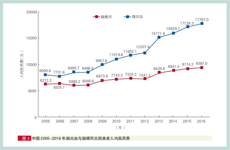 《2017中国卫生和计划生育统计年鉴》数据显示,2005—2016年我国脑出血与脑梗死的住院人数及人均医药费用均呈增长态势,2016年我国脑出血与脑梗死患者住院人均费用分别为17787.0、9387.0 元,相比2010年分别增长61.4%、31.4%。