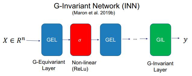 Maron et al. 提出了一种架构,对于拥有图不变映射层(graph invariant layer)和图等变映射层(graph equivariant layer)的 GNN,如果在一个非线性层(比如 ReLU)之后堆叠等变映射层,层层叠加,然后在最后添加图不变映射层。可以看出这样的模型能在输入的排列方式变化时保持映射不变性。这样的模型被称为图不变网络(INN)。