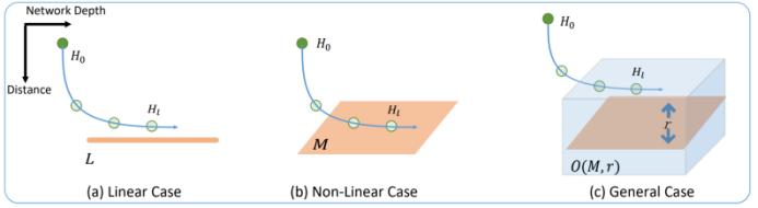 综合这些不等式,可得到隐变量的子空间距离沿层数变化的收敛性。可以看到,随着层数趋近于无穷大,子空间距离将趋近于 0,因此隐变量将会收敛到子空间 M。