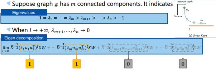 要知道这个过平滑过程发生的位置,我们先讨论一下 GCN 何时会因过平滑而失效?我们将讨论三种过平滑的情况。第一种是使用线性激活时,隐变量 H_L 会收敛到一个特定的点。第二种是使用 ReLU 激活时,H_L 会收敛到一个特定的平面 M。第三种是使用 ReLU 加偏差时,H_L 会收敛到一个特定的子立方体 O(M, r) 的表面。