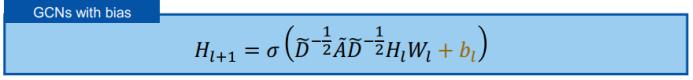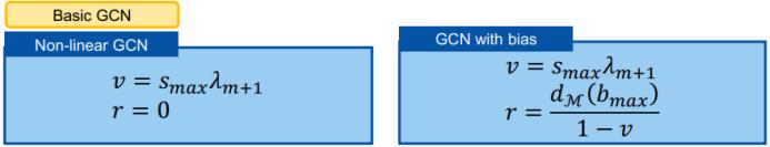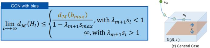 接下来是更一般的情况,使用 ReLU 加偏差的 GCN 又如何呢?H_L 将收敛到一个特定子立方体 O(M,r) 的表面上。首先,我们写出带偏差的 GCN 的公式: