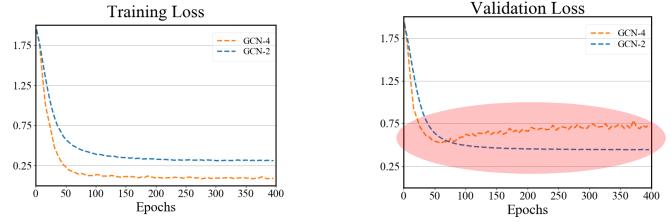 首先来看过平滑。GNN 本质上是逐层推送彼此相邻节点混合的表征,因此极端地看,如果层数无限多,那么所有节点的表征都将收敛到一个驻点,这也就与输入特征完全无关了,并会导致梯度消失问题。因此,过平滑的一个现象是模型的训练损失和验证损失都难以下降。那么,为什么会出现过平滑呢?