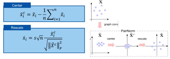 PairNorm 的思路对 GCN 输出进行居中和重新缩放或归一化,使得总的两两平方距离保持不变。如图所示,GCN 的输出点在图卷积之后通常会更接近彼此。但通过使用 PairNorm,新输出的两两距离能与输入的距离保持相似。