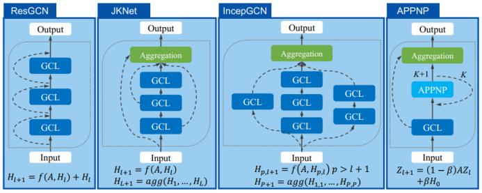 高阶 GNN:高阶 GNN 是指通过扩展感受野来将高阶相近度(high-order proximities)编码到图中。高阶相近度描述的是距离更多样的节点之间的关系,而不仅是近邻节点之间的关系。这方面的研究工作包括 DCNN(通过把转移矩阵的幂级数堆叠起来而将邻接矩阵扩展为张量,然后相互独立地输出节点嵌入和图嵌入)、MixHop(使用了归一化的多阶邻接矩阵,然后汇集各阶的输出,从而同时得到高阶和低阶的相近度)、APPNP(使用了个性化 PageRank 来为目标节点构建更好的近邻关系)。