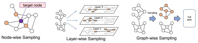为了让 GNN 有能力处理大规模图,研究者已经提出了三种不同的采样范式:基于节点的采样、基于层的采样和基于子图的采样。