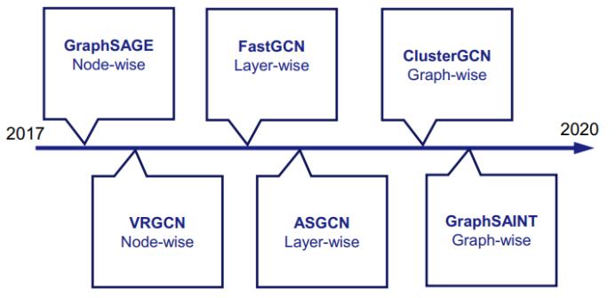 近些年在构建大规模 GNN 方面已经出现了一些成果,下图给出了这些成果的时间线: