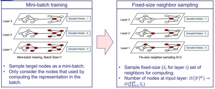 为了解决这一问题并进一步提升性能,GraphSAGE 采用了固定采样个数的的邻近采样方法,即每层都采样固定大小的邻近节点集合。