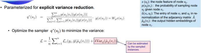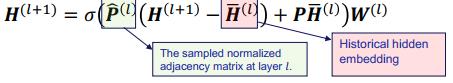 为了进一步降低采样规模和得到一些理论上的质量保证,VR-GCN 整合了基于控制变量的估计器(CV 采样器)。其可以维持历史隐藏嵌入(historical hidden embedding)来获得更好的估计,这个历史隐藏嵌入可用于降低方差,进而消除方差,实现更小的采样规模。VR-GCN 的数学形式如下: