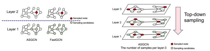 为了更好地获得层之间的相关性,ASGCN 提出了自适应层式采样方法,即根据高层采样结果动态调整更低层的采样概率。如下左图所示,在对底层采样的时候 ASGCN 会考虑采样高层采样的邻居节点,使得层之间的相关性得到很好的保留。如下右图所示,整个采样过程是自上而下的。我们首先采样输出层的目标节点,然后根据其采样结果采样中间层的节点,然后重复这个过程直到输入层。在采样过程中,每层采样节点的数目也会保持一个固定值。