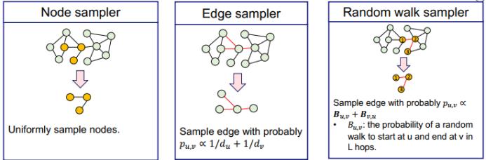 GraphSAINT 则并未在采样过程中使用聚类算法(这会引入额外的偏差和噪声),而是直接通过子图采样器来采样用于 mini-batch 训练的子图。其给出了三种采样器的构建方式,分别为基于节点的采样、基于边的采样和随机游走采样,如下所示: