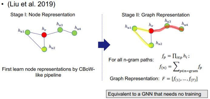 我们要介绍的第一种方法是 N-Gram Graph。该方法分为两个阶段:节点表征阶段和图表征阶段。节点表征阶段使用了一种传统的自监督式节点嵌入方法 CBoW 来学习节点表征。在第二个阶段,由于已有节点表征,则首先会为每条长度为 n 的路径计算表征,称为 n-gram 路径。这个路径表征是以该路径中每个节点的表征的积形式得到的。因此,它们将历经图中所有的 n-gram 路径并归总所有路径的表征。最终的图表征是通过将 1-gram 到 T-gram 的路径连接起来而得到的。