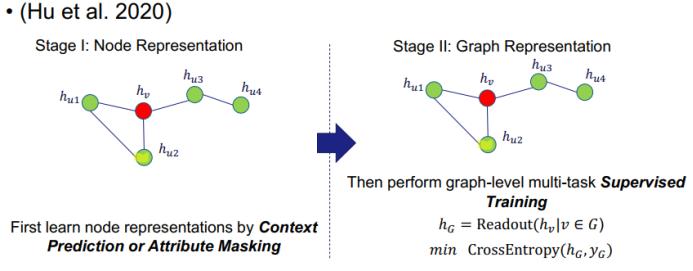 另一种用于图分类的方法是 PreGNN,它同样分为两个阶段:第一个阶段是执行节点表征(但使用了两种全新方法),第二阶段是使用简单的读出基于所有节点获取图层面的表征。但它是通过一种监督式策略交叉熵来训练图层面的表征。该研究指出,节点层面和图层面的训练对最终性能而言都很重要。